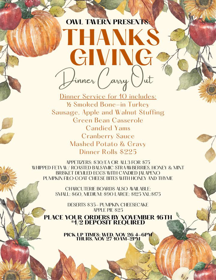 Friendly reminder, its already the 7th!! Sign up by the 16th in order to secure your spot for our fabulous smoked turkey dinner carry out! Call or stop in! Owl see ya soon ♥️