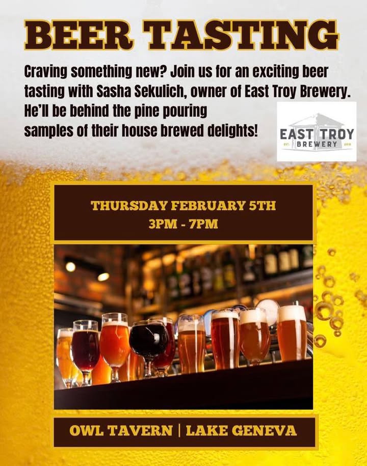 Off early? Or still boppin’ around checkin’ out the snow/ice sculptures ? ❄️ ⛄️ Whelp, Happy-Hour starts at 3, the Owl Tavern! We have somethin’ special for ya! Come sample the “new brews” from East Troy Brewery.🍻this Thursday @3pm. Regular Menu, Champion Pizza & specials to come! Best time of year to try a cup or bowl of 🌶️ – chicken elote chili 🥣 broccoli cheese soup 👉🏼or either w/a bread bowl for $10 👉🏼 Have ya tried an Owl’d Fashioned? Do it! Then buy a bottle of bourbon for your shelf. 🥃🤎 Cheers! 🍻