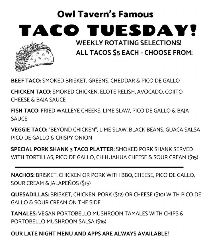 Back To Homepage See you for dinner? The pork shank taco platter is on the menu!!! Hooray! View Full Post On Facebook π£π Fish Fry Friday! Andβ¦ π₯ roll... π£π Fish Fry Friday! Andβ¦ π₯ roll please π₯Owl Tavern Bourbon is HERE! πΆββοΈ π Try her neat or a couple cubes or Our new Owlβd Fashioned & then buy a bottle! (We have them… Guess what we are doing this sno... Guess what we are doing this snowy morning? Squee! Bourbon today! See you after 3! Swoop on in π¦π₯! View Full Post On Facebook Thirsty Throw Back Thursday star... Thirsty Throw Back Thursday starts today @3! π₯³$2 throw backπΊβs! Oldstyle! Hamms! Schlitz! Montucky! Hungry? π€€ πΆοΈ Pork Chili (red) π₯£ Beef vegetable with dumplings βοΈ Fried Chicken Sammy w/Mayo & Pickles βοΈ Fried Cod… Wow! 50Β° yesterday to 21Β° today!... Wow! 50Β° yesterday to 21Β° today! Come. Warm. Those. Tootsies tonight w/us at Owl Tavern! π₯ π₯ π₯ π₯ Pork Chili (red) πΆοΈ Beef vegetable w/dumplings π₯© Italian beef w/cheese n gardinara! π Fried cod… See you after 3 yum π See you after 3 yum π View Full Post On Facebook