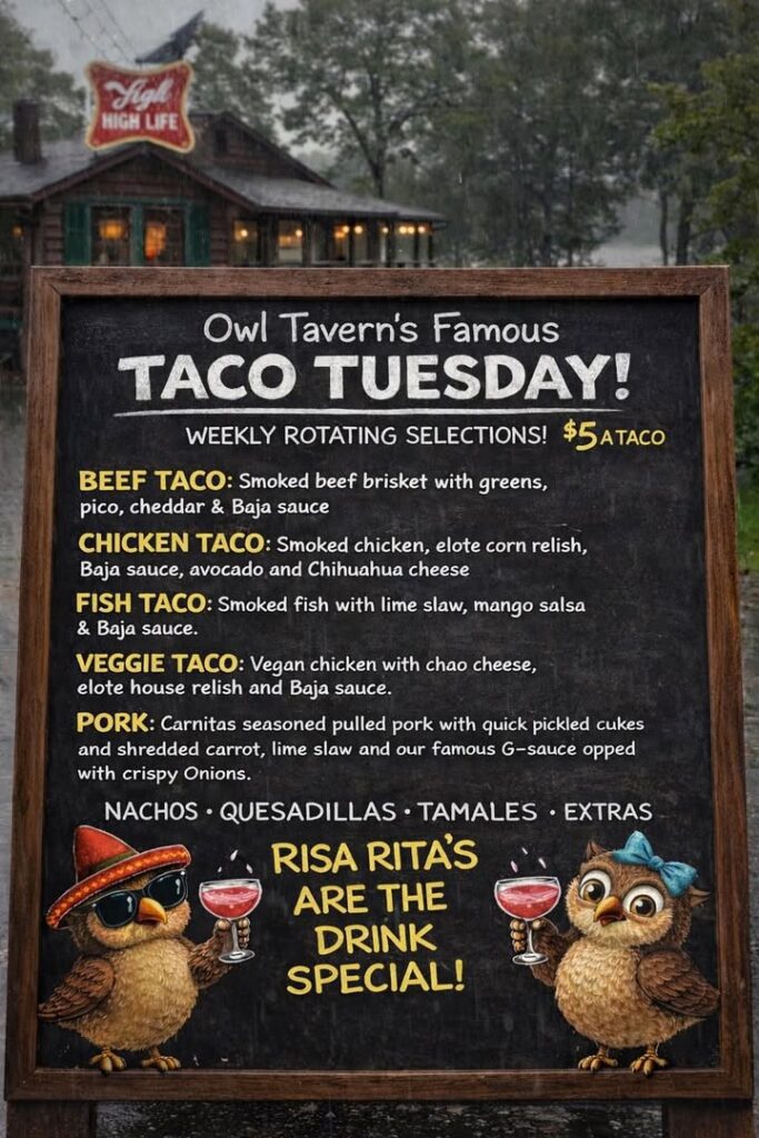 Something about a Tuesday… a Taco Tuesday that is!! Owl Tavern 3pm We have your dinner arrangements covered, whether you prefer takeout or dining in. Enjoy a ‘Risa ‘Rita while you wait. Stay dry out…