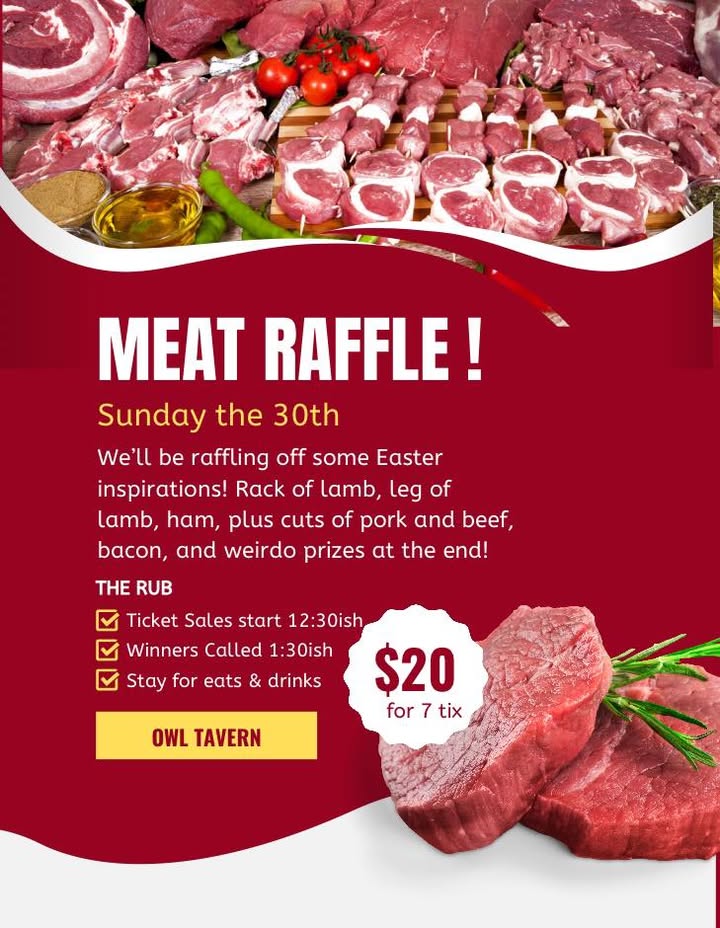 Up next… one of our famous meat raffles! Good quality meats and silly fun with the after raffle. And we are doing a special side raffle for a fantastic prize! See you Sunday!
